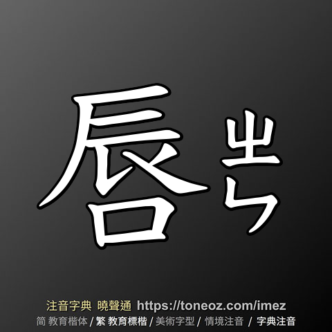 唇,注音ㄓㄣ,拼音zhēn,辭典解釋為:[形] 驚駭。《說文解字.口部》:「唇,驚也,從口辰聲。」