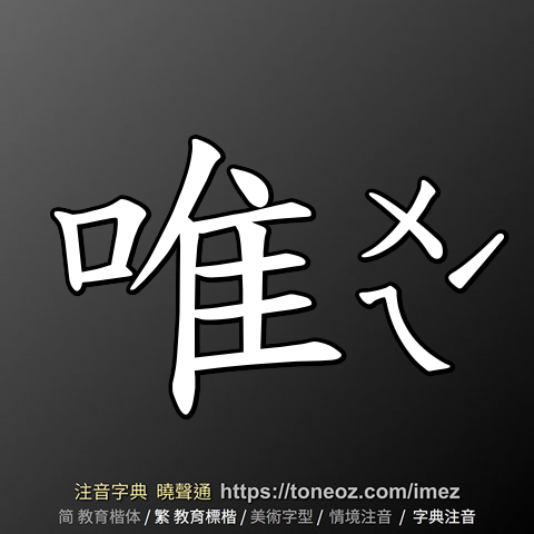 唯,注音ㄨㄟˊ,拼音wéi,辭典解釋為:1.獨、只有。例:唯一、唯有、唯利是圖 2.願、希望。例:臣請就湯鑊,唯大王與群臣孰計議之。(《史記.卷八一.廉頗藺相如傳》) 3.連詞。表示讓步關係,相當於「雖然」、「縱使」。例:唯天子亦不說也。(《史記.卷一二○.汲黯傳》) 4.表示應答的語詞。例:唯諾、唯唯諾諾