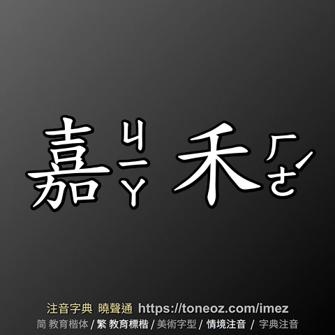 嘉禾,注音ㄐㄧㄚ ㄏㄜˊ,拼音jiā hé,辭典解釋為:豐碩美好的穀物。例:嘉禾在古時被認為是吉祥的象徵。