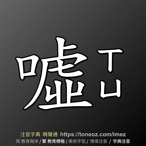 噓,注音ㄒㄩ,拼音xū,辭典解釋為:1.緩緩吐氣。例:噓氣 2.發出嘆氣、感嘆的聲音。例:唏噓不已、長噓短嘆 3.誇口。例:自我吹噓 4.問候。例:噓寒問暖 5.表示鄙斥或警惕的。例:噓聲四起 6.嘆詞。表示制止或驅逐的語氣。例:噓!別出聲。