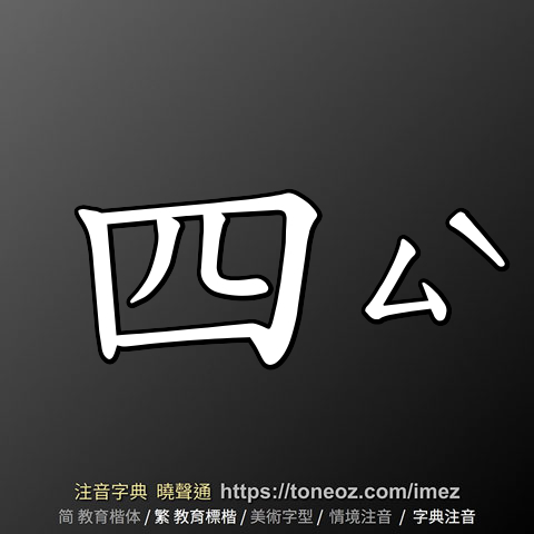 四,注音ㄙˋ,拼音sì,辭典解釋為:1.介於三和五之間的自然數。大寫作「肆」,阿拉伯數字作「4」。例:三、四、五、六……。 2.第四的。例:四年級、四更天、四品官 3.多方面的。例:四平八穩、四通八達