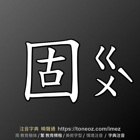 固,注音ㄍㄨˋ,拼音gù,辭典解釋為:1.結實、堅硬。例:牢固、穩固、堅固 2.使穩定。例:鞏固、固定、守源固本 3.堅決的。例:固守、固辭、固執己見 4.原來、一向。例:固有、固知、固所願也 5.→固然