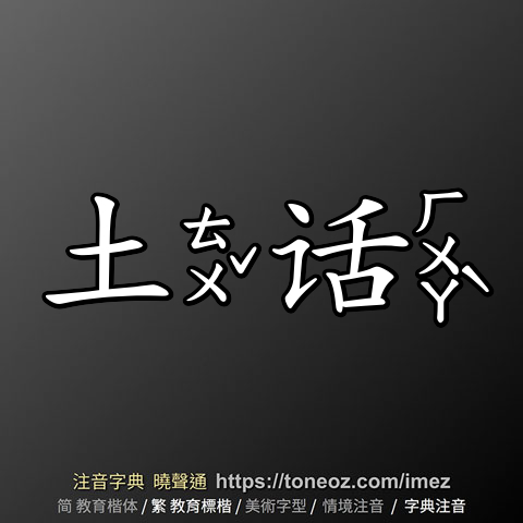 辭典解釋為:土,1.地面沙泥等的混合物。例:泥土、黏土、積土成山 2.土地、疆域。例:國土、領土、疆土 3.國、鄉。例:故土、吾土吾民 4.地方性的。例:土產、土話 5.古老流傳的、民間沿用的。例:土方、土法煉鋼 6.不合潮流的。例:土氣 7.五行之一。...