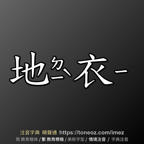 地衣,注音ㄉㄧˋ ㄧ,拼音dì yī,辭典解釋為:1.鋪在地上的紡織品。《新唐書.卷一八一.列傳.曹確》:「教舞者數百,皆珠翠襐飾,刻畫魚龍地衣,度用繒五千。」五代十國.李煜〈浣溪沙.紅日已高三丈透〉詞:「金爐次第添香獸,紅錦地衣隨步皺。」 2.植物名。一群隱花植物,是真菌類植物與藍綠藻或綠藻植物的共生體。最容易在不良環境生存的植物,其菌絲善吸收水分及礦物質,以供藻類進行光合作用,製造有機物供菌類。