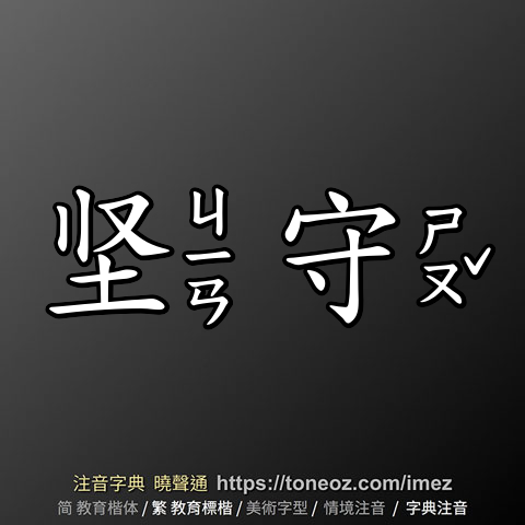 辭典解釋為:守,1.防衛、看管。例:防守、駐守、守護 2.保持、遵行。例:守節、守法、墨守成規 3.駐留。例:守候、守株待兔 4.氣節、品格。例:操守、有為有守 5.古代一郡的行政長官。例:郡守、太守...