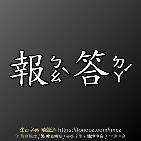 報答,注音ㄅㄠˋ ㄉㄚˊ,拼音bào dá,辭典解釋為:酬謝恩惠。例:幫助別人是應該的,不應有希望別人報答的心態。