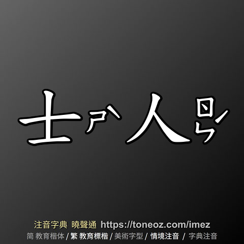 士人,注音ㄕˋ ㄖㄣˊ,拼音shì rén,辭典解釋為:1.泛稱研究學問或有學問的人。《孔子家語.卷一.五儀解》:「所謂士人者,心有所定,計有所守,雖不能盡道術之本,必有率也。」《文選.范曄.宦者傳論》:「漢興仍襲秦制,置中常侍官,然亦引用士人以參其選。」 2.男子的通稱。 3.人民、百姓。《後漢書.卷七五.袁術傳》:「今孤以土地之廣,士人之眾,欲徼福於齊桓,擬跡於高祖,可乎?」