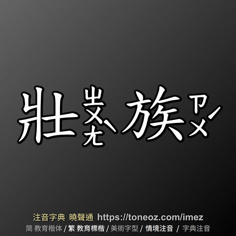 壯族,注音ㄓㄨㄤˋ ㄗㄨˊ,拼音zhuàng zú,辭典解釋為:中國少數民族之一。族源與百越、俚、僚族有關,在宋代時曾有儂智高建立政權。主要居住在廣西,廣東、雲南、貴州、湖南省也有散居,是少數民族中人口最多的一族。所操語言屬漢藏語系壯侗語族壯傣語支,有南北兩種方言。大都兼通漢語文。信仰多神,崇拜巨石、老樹、高山和祖先,除此之外,亦見佛、道教的傳布。社會由一夫一妻的小家庭組成,有婚後不落夫家的習俗。經濟以農業為主,兼營漁、牧業。傳統住屋形式為「干欄」,上層住人,下層圈養牲畜。在傳統文獻中有「獞族」、「撞族」、「僮族」的記載,這三個字的讀音都是「壯」,是壯族的另稱。也作「8ff0._104_0.gif族」、「僮族」、「撞族」。