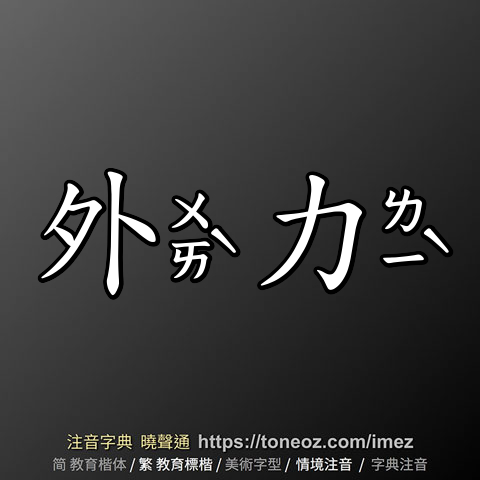 外力,注音ㄨㄞˋ ㄌㄧˋ,拼音wài lì,辭典解釋為:外來、外部的力量。例:那個鐵桶受到外力的撞擊,已經凹了一個洞。
