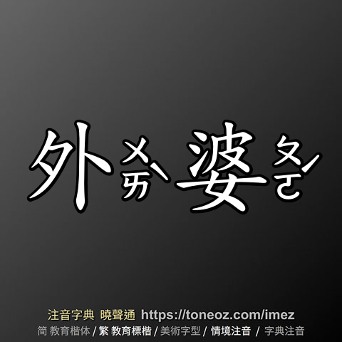 外婆,注音ㄨㄞˋ ㄆㄛˊ,拼音wài pó,辭典解釋為:稱謂。對媽媽的母親的稱呼,今亦稱「阿嬤」或「阿婆」。例:每到過年,媽媽都會帶我們向外婆拜年。 △外祖母