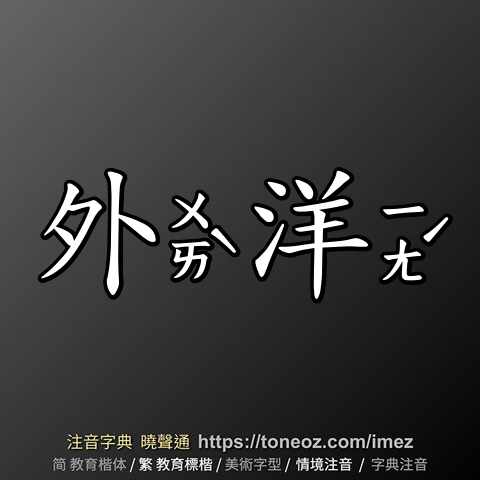 外洋,注音ㄨㄞˋ ㄧㄤˊ,拼音wài yáng,辭典解釋為:海外、外國。《文明小史》第三○回:「但則我們中國已被外洋看到一錢不值。」《二十年目睹之怪現狀》第九一回:「後來等到大哥從外洋回來,你看我何等巴結他。」