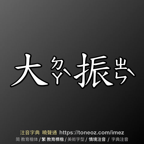 大振,注音ㄉㄚˋ ㄓㄣˋ,拼音dà zhèn,辭典解釋為:大大地振作。《三國演義》第一七回:「於是大小將士無不向前,軍威大振。」