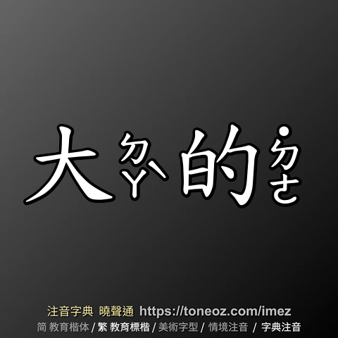 辭典解釋為:大,1.表示體積、面積、容量、數量、年齡等廣、多。與「小」相對。例:大山、大雨、大人 2.最年長的、排行第一的。例:大哥、大伯 3.不平常、重要的、偉大的。例:立大志做大事 4.表程度深。例:大紅大紫、大吃一驚、大有出息 5.差不多、不很精確。例:大約、大概、大略 6.表示尊敬之詞。例:大作、大名 7.時間上更前或更後,有強調的意味。例:大前天、大後天 8.與「不」字連用,表次數少或程度淺。例:她不大愛講話。...