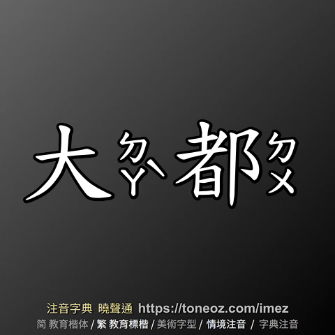 大都,注音ㄉㄚˋ ㄉㄡ,拼音dà dōu,辭典解釋為:1.大概。《三國志.卷八.魏書.張魯傳》:「有病自首其過,大都與黃巾相似。」唐.柳宗元〈與蕭翰林俛書〉:「長來覺日月益促,歲歲更甚,大都不過數十寒暑。」 2.大多數。《兒女英雄傳》第一九回:「便是那史書上所載的那些忠臣烈士以至愚夫愚婦,雖所遇不同,大都各有個萬不得已。」