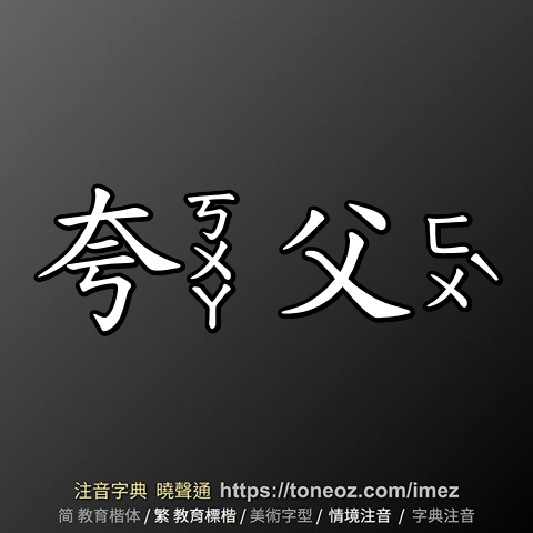 夸父,注音ㄎㄨㄚ ㄈㄨˋ,拼音kuā fù,辭典解釋為:古代神話中的人物。傳說為了與太陽追趕競走,渴死在途中。見《山海經.海外北經》。