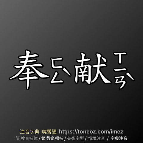 辭典解釋為:奉,1.用雙手捧著以表恭敬。例:奉茶、奉上 2.表示尊重之詞。例:奉陪、奉送、奉還 3.謹守、遵循。例:信奉、奉公守法 4.接受。例:欣奉華翰、奉命前來 5.供養、侍候。例:奉養、侍奉、供奉...