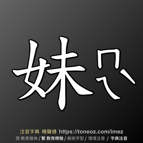 妹,注音ㄇㄟˋ,拼音mèi,辭典解釋為:1.稱謂:(1) 稱同父母所生而比自己年幼的女子。例:姊妹、么妹 (2) 稱同輩中較自己年幼的女子。例:表妹、堂妹 (3) 稱較自己晚入門或入學的女子。例:師妹、學妹 (4) 稱年輕的女性。例:端茶的小妹 2.女子對同輩的自謙之詞。例:小妹我年幼無知,請多多指教。
