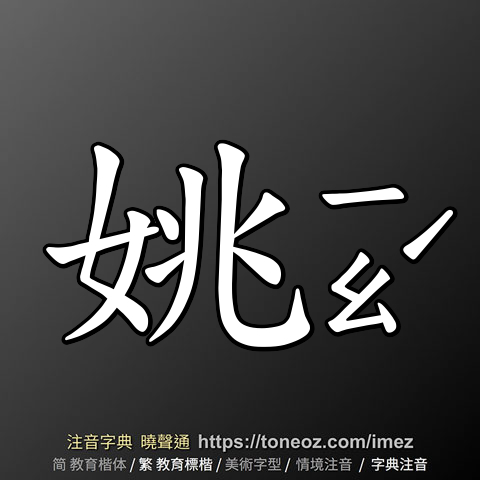 姚,注音ㄧㄠˊ,拼音yáo,辭典解釋為:1.美好。通「窕」。例:姚冶 2.姓。