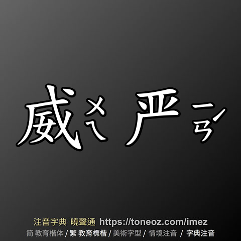 辭典解釋為:威,1.使人敬畏的態度或能壓服人的力量。例:威嚴、示威、狐假虎威 2.震懾、逼迫。例:威震天下...