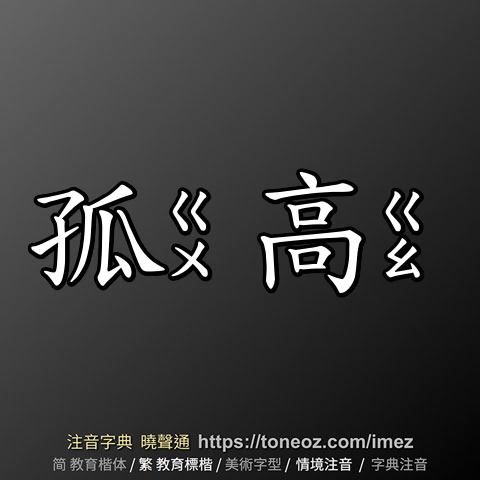 孤高,注音ㄍㄨ ㄍㄠ,拼音gū gāo,辭典解釋為:1.孤立高聳。唐.高適〈同諸公登慈恩寺浮圖〉詩:「登臨駭孤高,披拂欣大壯。」 2.人的性情超脫不俗。唐.李中〈獻張拾遺〉詩:「官資清貴近丹墀,性格孤高世所稀。」