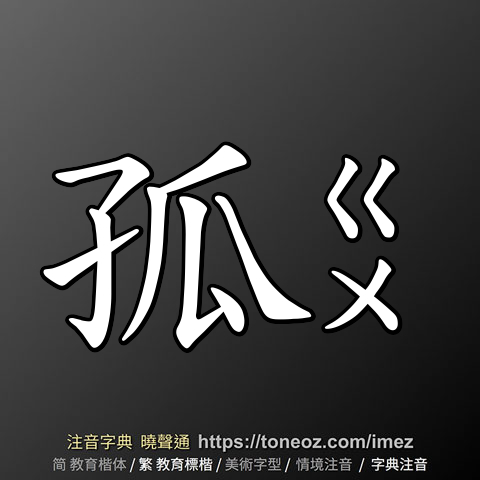 孤,注音ㄍㄨ,拼音gū,辭典解釋為:1.幼年喪父或父母雙亡。例:孤兒 2.單獨。例:孤雁、孤身前往 3.特出、怪異。例:孤僻 4.古代王侯的謙稱。 5.戲劇中扮演官吏的腳色。
