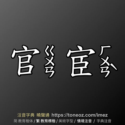 官宦,注音ㄍㄨㄢ ㄏㄨㄢˋ,拼音guān huàn,辭典解釋為:做官的人。《大宋宣和遺事.亨集》:「天子見了佳人,問高俅道:『這佳人非為官宦,亦是富豪之家。』」