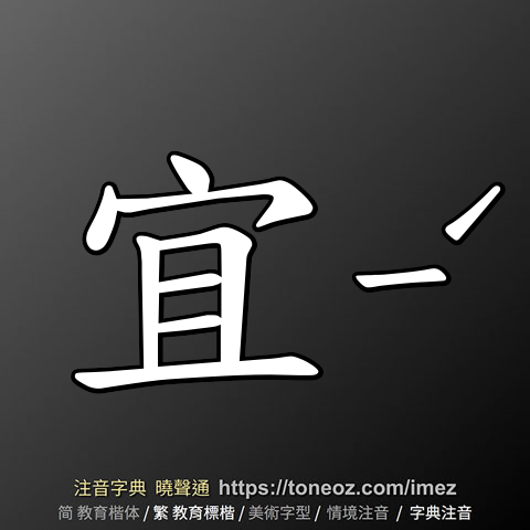 宜,注音ㄧˊ,拼音yí,辭典解釋為:1.應該、應當。例:不宜喧鬧、不宜妄自菲薄 2.合適、適當。例:合宜、適宜、動靜皆宜 3.相安、和順。例:宜室宜家、宜兄宜弟 4.姓。