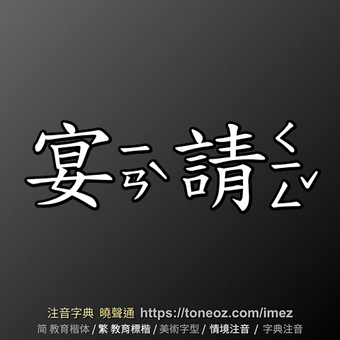 宴請,注音ㄧㄢˋ ㄑㄧㄥˇ,拼音yàn qǐng,辭典解釋為:設置筵席款待賓客。例:祖父決定姑姑結婚當天在飯店宴請親朋好友。