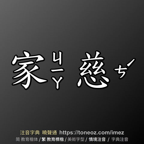 家慈,注音ㄐㄧㄚ ㄘˊ,拼音jiā cí,辭典解釋為:稱謂。對別人稱自己的母親。例:家慈大人 △家母