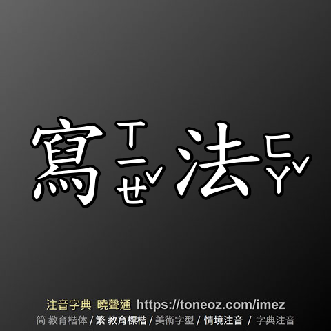 寫法,注音ㄒㄧㄝˇ ㄈㄚˇ,拼音xiě fǎ,辭典解釋為:1.寫作方法。如:「大家聚在一起商量這封請柬該怎麼個寫法。」 2.書寫方法。如:「這個字有好幾種寫法,到底那一種才是正確的?」