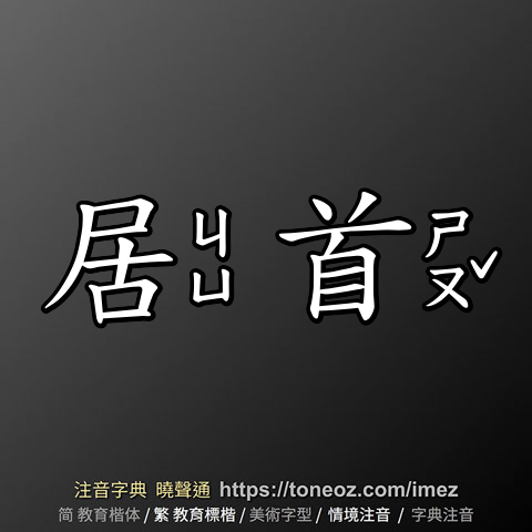 居首,注音ㄐㄩ ㄕㄡˇ,拼音jū shǒu,辭典解釋為:占第一位。語本《詩經.大序》唐.孔穎達.正義:「六義,風居其首。」