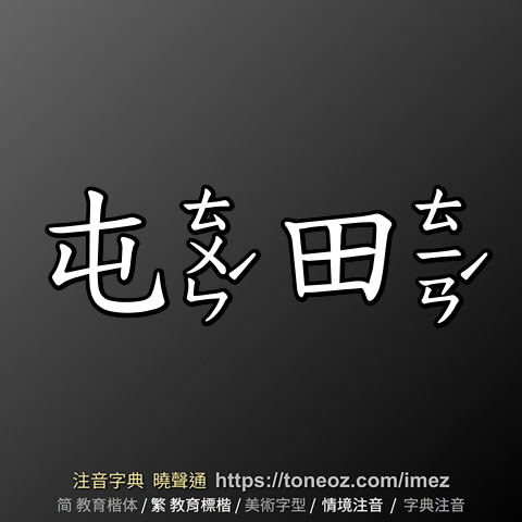 屯田,注音ㄊㄨㄣˊ ㄊㄧㄢˊ,拼音tún tián,辭典解釋為:古代軍隊在駐防的地區,開墾田地的制度。例:古代的軍隊,因為補給不方便,所以推行屯田。