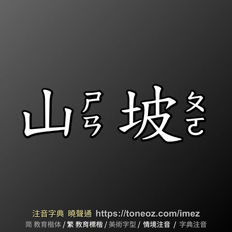 山坡,注音ㄕㄢ ㄆㄛ,拼音shān pō,辭典解釋為:山頂與平地間的斜面地帶。例:我家門前有小河,後面有山坡,山坡上有野花朵,野花紅似火。