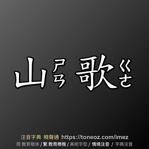 山歌,注音ㄕㄢ ㄍㄜ,拼音shān gē,辭典解釋為:流行於山村的民間歌謠。歌詞多為即興創作,內容以表現工作與愛情生活為主。曲調質樸,節奏自由。例:農村的青年男女,常以山歌表達愛意。