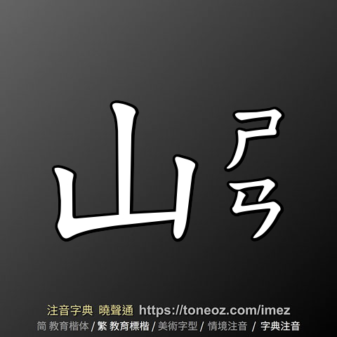 山,注音ㄕㄢ,拼音shān,辭典解釋為:陸地上高起的部分。例:山岳、爬山、高山