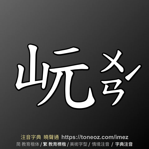 岏,注音ㄨㄢˊ,拼音wán,辭典解釋為:[形] 巑岏:山勢高聳。《集韻.平聲.桓韻》:「岏,巑岏,山銳貌。」《文選.宋玉.高唐賦》:「盤岸巑岏,裖陳磑磑。」
