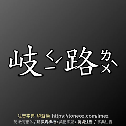 岐路,注音ㄑㄧˊ ㄌㄨˋ,拼音qí lù,辭典解釋為:1.由大道分岔出去的小路。唐.李白〈行路難〉:「行路難,行路難,多岐路,今安在?」《儒林外史》第一回:「人生南北岐路,將相神仙,也要凡人做。」也作「歧路」。 2.邪路、歪路。《後漢書.卷四四.鄧彪傳.論曰》:「故昔人明慎於所受之分,遲遲於岐路之閒也。」也作「歧路」。