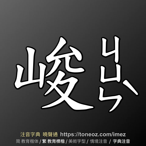 峻,注音ㄐㄩㄣˋ,拼音jùn,辭典解釋為:1.山勢高聳、陡峭。例:峻峭、峻險、崇山峻嶺 2.偉大、崇高。例:峻命、峻節、峻德 3.嚴厲、苛刻。例:峻刑、嚴刑峻法