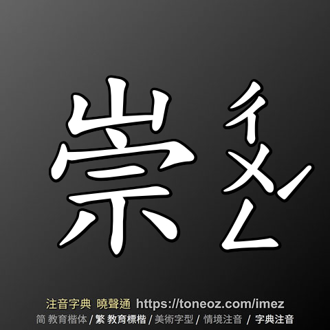 崇,注音ㄔㄨㄥˊ,拼音chóng,辭典解釋為:1.高峻的。例:崇高、崇山峻嶺 2.尊敬、重視。例:尊崇、推崇、崇尚