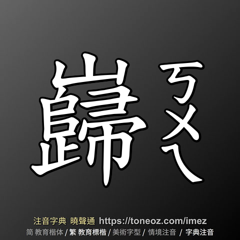 巋,注音ㄎㄨㄟ,拼音kuī,辭典解釋為:[形] 小山羅列。《爾雅.釋山》:「小而眾,巋。」宋.邢昺.疏:「言山小而眾,叢萃羅列者名巋。」 [副] 高大堅固的樣子。《文選.王延壽.魯靈光殿賦.序》:「自西京未央建章之殿,皆見隳壞,而靈光巋然獨存。」宋.張載.注:「巋然,高大堅固貌也。」