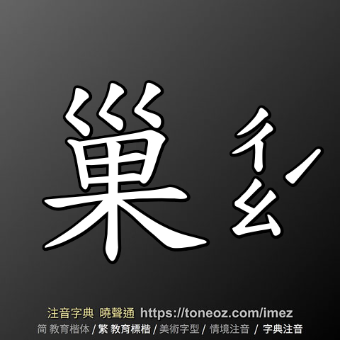 巢,注音ㄔㄠˊ,拼音cháo,辭典解釋為:1.鳥類、昆蟲或其他動物的窩。例:鳥巢、蜂巢、鵲巢 2.盜賊聚集的地方。例:賊巢、匪巢