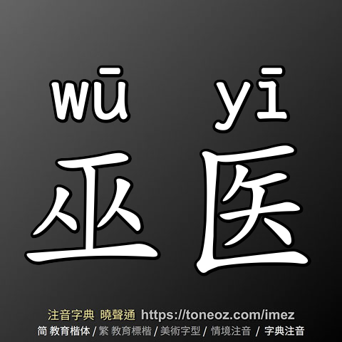 辭典解釋為:巫,鬼神的代言人或是替人占卜、祈禱,並祈求鬼神賜福、解決吉凶問題的人。例:女巫、巫祝、巫醫...