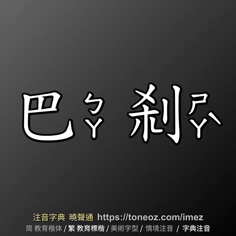 辭典解釋為:巴,1.期望、盼望。例:巴望、巴不得 2.接近、貼近。例:前不巴村,後不著店。 3.指四川東部。例:巴蜀 4.因乾燥、溼稠凝結成塊的東西。例:泥巴、鹽巴 5.詞綴。附屬在物體下面或後面的東西。例:尾巴、嘴巴 6.量詞。計算大氣壓力的單位。每平方公尺受力十萬牛頓,即每平方公分受力一百達因的壓力稱為「一巴」,其千分之一稱為「毫巴」。§英bar例:一標準大氣壓力等於1.013巴。 △巴爾 7.姓。...