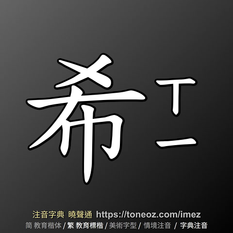 希,注音ㄒㄧ,拼音xī,辭典解釋為:1.少有、不多。通「稀」。例:希罕、希有 2.盼望、仰慕。例:希求、希冀、希望