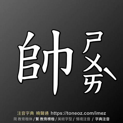 帥,注音ㄕㄨㄞˋ,拼音shuài,辭典解釋為:1.軍隊中職級最高的指揮官。例:統帥、元帥、帥旗 2.面容俊俏的或舉止瀟灑的、有風度的。例:帥氣、帥哥 3.事情美好,令人滿意的表示。例:帥啊!好一支再見全壘打! 4.姓。