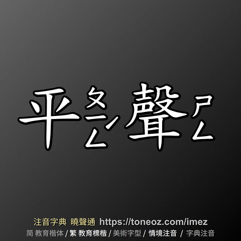 平聲,注音ㄆㄧㄥˊ ㄕㄥ,拼音píng shēng,辭典解釋為:一種漢語調類。聲調平出,而沒有高低的變化。今國音分化為陰平、陽平二類,即第一聲、第二聲。第一聲注音符號不標調號,第二聲注音符號用「ˊ」來表示。如風、清是陰平聲,逢、來是陽平聲。