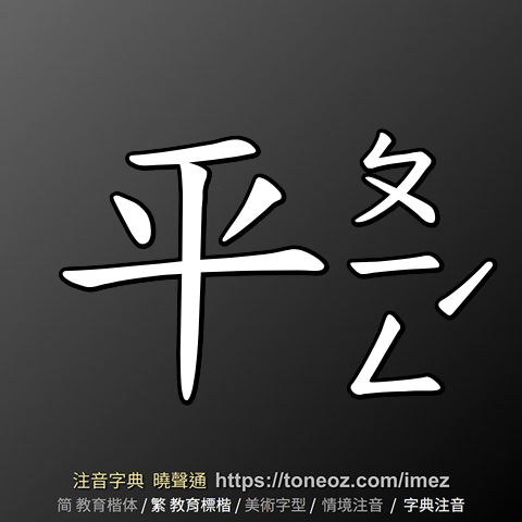 平,注音ㄆㄧㄥˊ,拼音píng,辭典解釋為:1.沒有凹凸、不傾斜的。例:平坦、平地、平原 2.均等的、不分勝負的。例:平均、平等、平手 3.安寧的、沒有事端的。例:太平、心平氣和、風平浪靜 4.尋常的、普通的。例:平日、平常、平淡無奇 5.使安定、征服。例:平定、平息、平亂 6.壓抑。例:怨氣難平 7.填平,使平整。例:譬如平地,雖覆一簣,進,吾往也。(《論語.子罕》) 8.漢語聲調之一。指平聲。例:平上去入