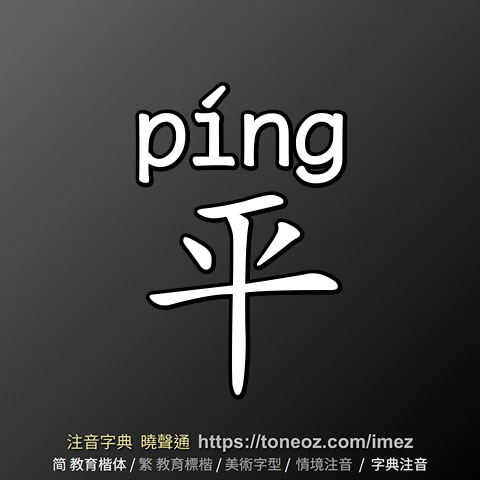 平,注音ㄆㄧㄥˊ,拼音píng,辭典解釋為:1.沒有凹凸、不傾斜的。例:平坦、平地、平原 2.均等的、不分勝負的。例:平均、平等、平手 3.安寧的、沒有事端的。例:太平、心平氣和、風平浪靜 4.尋常的、普通的。例:平日、平常、平淡無奇 5.使安定、征服。例:平定、平息、平亂 6.壓抑。例:怨氣難平 7.填平,使平整。例:譬如平地,雖覆一簣,進,吾往也。(《論語.子罕》) 8.漢語聲調之一。指平聲。例:平上去入