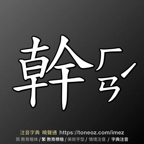 幹,注音ㄍㄢˋ,拼音gàn,辭典解釋為:1.築牆時支撐在牆兩端的木材。通「榦」。 2.事物的主體部分。例:軀幹、樹幹、骨幹 3.主要的。例:幹道、幹線、幹部 4.才能。例:文幹、才幹、幹練 5.事情。例:公幹、貴幹 6.從事、營求。例:他是幹那一行的?