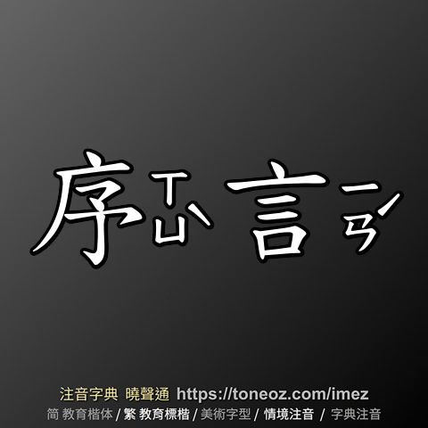 序言,注音ㄒㄩˋ ㄧㄢˊ,拼音xù yán,辭典解釋為:作者自己陳述作品主旨、寫作過程,或他人對著作的介紹評述。也作「序文」、「敘言」、「敘文」。